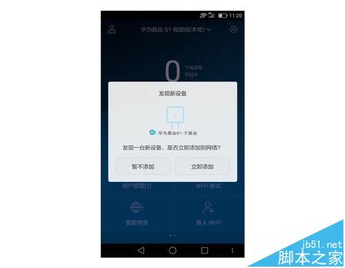 2、打開Huawei HiLink APP 并成功登陸到到華為路由Q1上,APP將自動檢測到新設備,進入首頁按照提示添加。