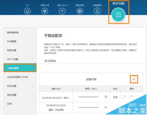 2、選擇“更多功能 > 子路由配置”,單擊“設備列表”右上角的 “+”圖標。