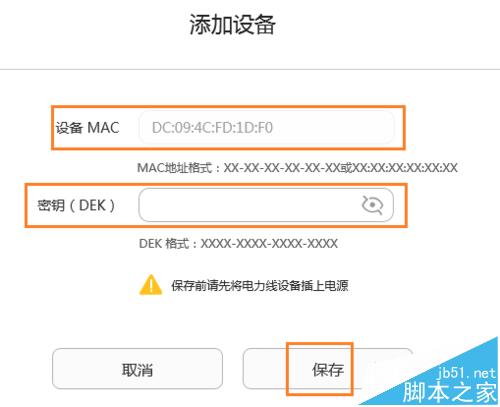 4、然后將子路由插到與母路由同一房間盡量靠近的墻插上,在瀏覽器“添加設備”頁面中輸入單買的子路由底部銘牌上的 MAC 地址和 DEK 碼。輸入完成后,確認子路由燈在閃爍時,點擊頁面上的“保存”。