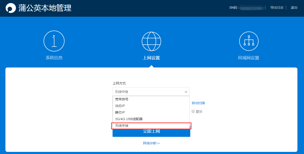 就可以進入到我們今天的主題了--網絡中繼的設置,上網方式我們選擇無線中繼