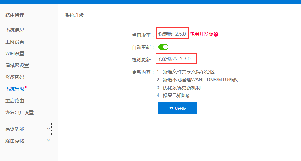 附:一般新拿到的路由器,第一次登陸進去之后,都會提示系統升級,如下圖,點擊升級,之后等待10分鐘即可