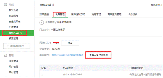 ①如果一個(gè)門店下面只存在一個(gè)SSID:微信連WIFI—設(shè)備管理—查看詳情—查看設(shè)備改造信息