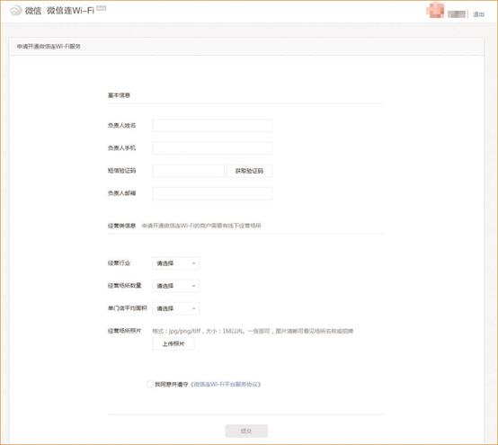 B.請(qǐng)按照微信的提示,完整填寫申請(qǐng)“微信連Wi-Fi”服務(wù)所需資料,并提交。