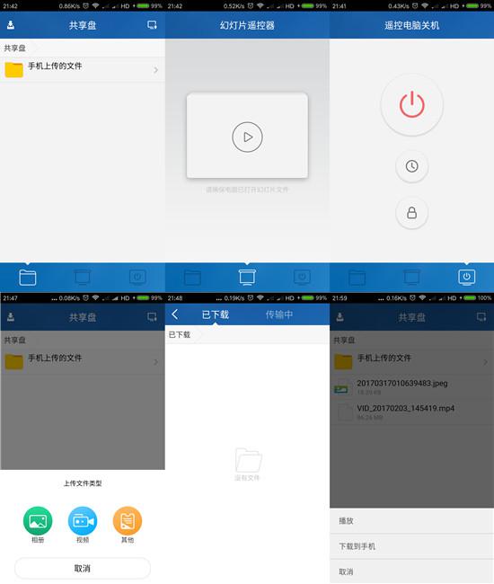 通過小米WiFi手機端(或平板電腦)APP可以實現手機傳文件到電腦、下載或直接查看電腦上的共享文件、幻燈片遙控器(使用時需要確保電腦中已打開幻燈片文件)、電腦關機、電腦定時關機、電腦鎖屏等功能。