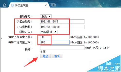 6、從彈出的新界面中,即可設(shè)置要限速的IP地址范圍,同時(shí)設(shè)置“限速方向”以及“上行流量”和“下行流量”,點(diǎn)擊“新增”按鈕即可完成相關(guān)限速規(guī)則的添加操作。