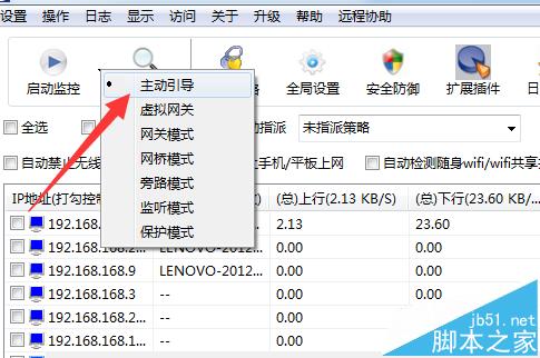 8、運(yùn)行此工具,并在程序主界面中點(diǎn)擊“啟用監(jiān)控”右側(cè)的下拉列表,從中根據(jù)當(dāng)前網(wǎng)絡(luò)結(jié)構(gòu)選擇一種控制模式,當(dāng)啟用監(jiān)控后,局域網(wǎng)所有聯(lián)網(wǎng)計(jì)算機(jī)并全部列出。