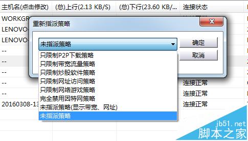 11、此時(shí)將打開(kāi)“重新指派策略”窗口,從其列出中選擇自己創(chuàng)建的新策略,點(diǎn)擊“確定”按鈕即可為特定計(jì)算機(jī)使用新的網(wǎng)速限制策略。