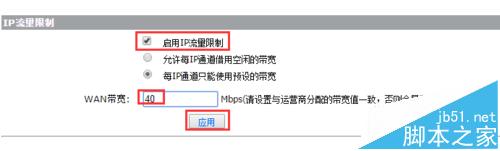 4、在“IP流量限制”選項(xiàng)卡界面,勾選“啟用IP流量限制”項(xiàng)以啟用IP流量限制功能,勾選“每IP通道只能使用預(yù)設(shè)的帶寬”項(xiàng),同時(shí)設(shè)置“WLAN帶寬”(即光纖接入帶寬“),點(diǎn)擊“應(yīng)用”按鈕。