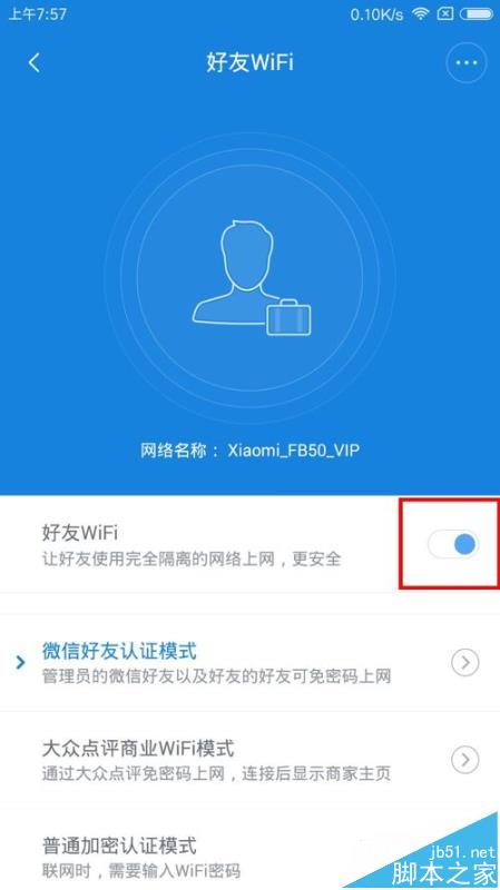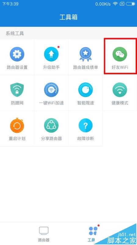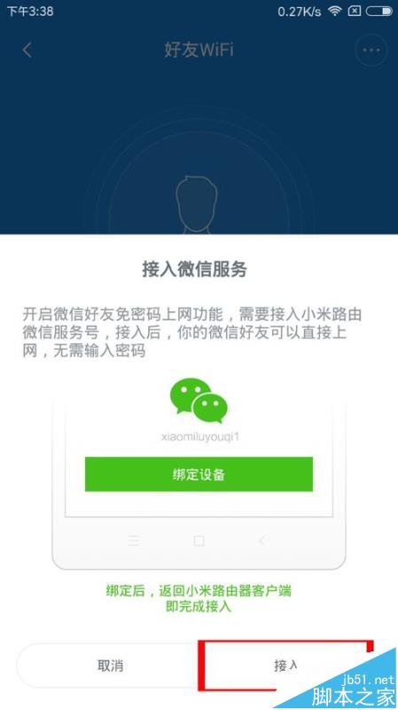 1、在路由器APP中找到“好友WiFi”,點擊后就跳出接入微信選項,會提示接入小米路由器微信服務號。