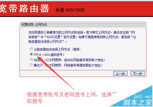 3、進(jìn)入設(shè)置向?qū)е螅c擊下一步進(jìn)行開始設(shè)置,選擇上網(wǎng)方式,這里選擇PPPOE(ADSL虛擬撥號)的方式進(jìn)行設(shè)置。也可以選擇自動設(shè)置。