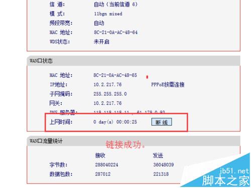 6、查看上網(wǎng)時長等信息。設(shè)置好之后,能夠正常上網(wǎng)就會顯示上網(wǎng)時間信息,如果想將斷開網(wǎng)絡(luò)直接點擊斷線即可。