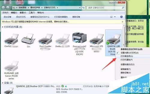 2、然后右鍵選中要設(shè)置的打印機(jī),選擇“打印首選項(xiàng)”。