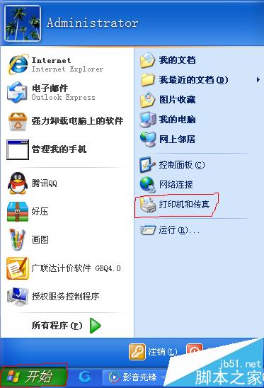 2、左擊“開始”在彈出的對話框里選擇“打印機和傳真”