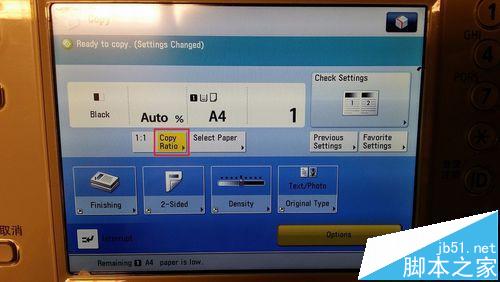 7、調(diào)整復(fù)印比例:如果回到復(fù)印主頁面,比例設(shè)為自動(Auto %),則打印機(jī)有可能自動將復(fù)印證件縮小。這時,需要預(yù)先設(shè)置復(fù)印比例:點擊Copy Ratio。