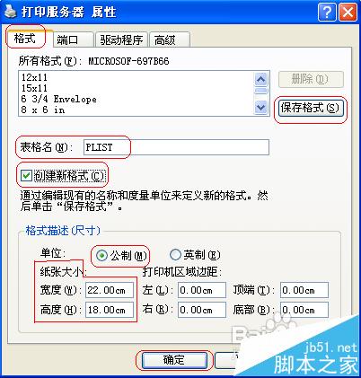 5、單擊“服務(wù)器屬性”彈出對(duì)話框如圖。格式→創(chuàng)建新格式(在“創(chuàng)建新格式”前勾選上)→表格名里輸入PLIST(根據(jù)自己的需要輸入)→選“公制”→把“紙張大小”輸入進(jìn)去22.00;18.00,(這個(gè)數(shù)是之前量好的)→保存格式→確定。這就保存好了我們需要的大小格式了。一會(huì)兒,在第7步就要用到創(chuàng)建好的格式。