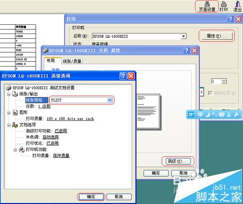 8、我們打開一個(gè)要打印的票據(jù)舉例說明第8步的操作,從打印預(yù)覽狀態(tài)下說起,如圖,點(diǎn)擊“頁面設(shè)置”→屬性→高級(jí)→選PLIST (之前創(chuàng)建好的表格名)→確定。重新啟動(dòng)電腦后就可以用了,默認(rèn)的就是剛創(chuàng)建的格式。