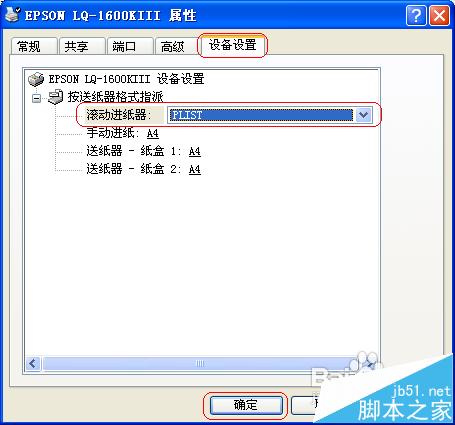 7、點(diǎn)擊“屬性”彈出對(duì)話框如圖,選“設(shè)備設(shè)置”命令在“滾動(dòng)進(jìn)紙器”找到剛才創(chuàng)建的表格名 PLIST ,點(diǎn)確定。這個(gè)時(shí)候還不能用剛創(chuàng)建的格式,還需要下一步的操作。
