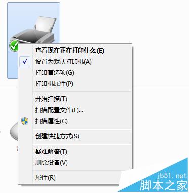 6、服務啟動之后,再打開“開始”——“設備和打印機”,右擊打印機,即可看到掃描選項了