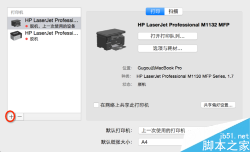 3.點擊 左下角處的加號,這樣就表示可以添加打印機了,如果想刪掉打印機的話,可以先選中上面的打印機,然后按減號!