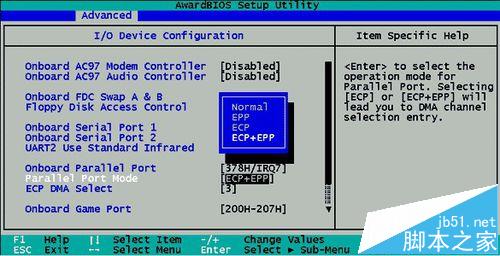 在 BIOS 設置里更改打印機并行口模式(如果您是使用傳統的打印線而不是 USB 打印線的話),進入 BIOS 中的“Integrated Peripheral → Parallel Port Mode”一項,有以下四種模式“SPP”(標準并行口)、“EPP”(增強并行口)、“ECP”(擴展并行口),“ECP+EPP”。如果您的打印機型號較老,則建議設為SPP 模式。當然,目前主流的打印機則建議設為ECP+EPP模式。