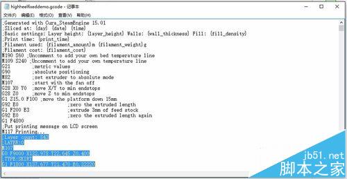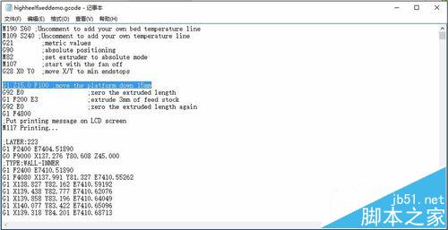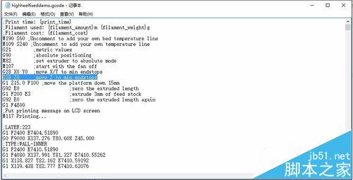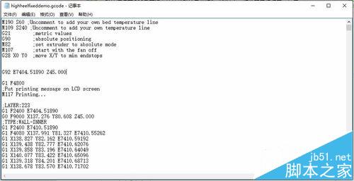 4、先另存文件,否則原來的G代碼就改了,從“layer223”以上的內容刪去,上限見圖,基本是LCD顯示狀態的語句之下,我用的cura切片軟件,其他軟件類似,注意不要刪掉啟動代碼,一會兒要改