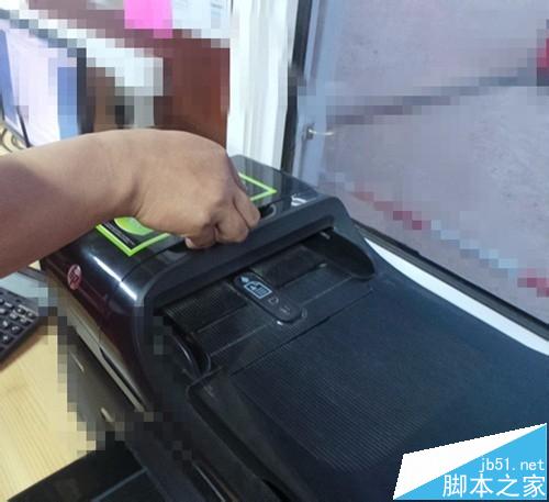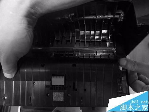 1、先把電給斷開,右手提住打印機進紙器縫隙,打印機左上角處,用力向上一提(也不要用力過太大),打開送紙器。如下圖。