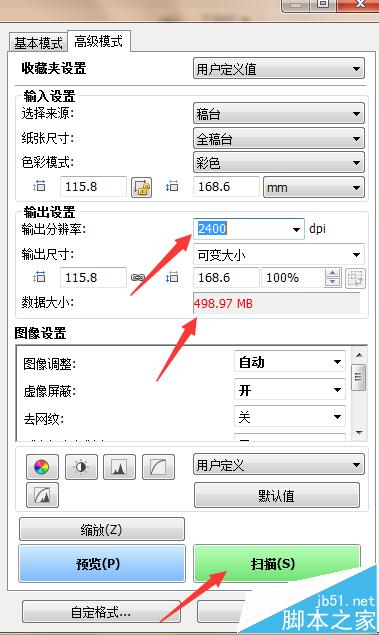 5、選擇2400dpi后你會發現,下面的數據大小框變為了紅色,有498MB,圖片特別大,不建議設置,除非有特別需求