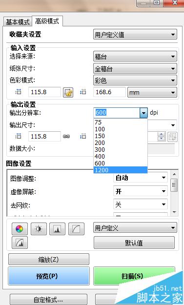 3、選擇高級模式-輸出設置-輸出分辨率,再下拉菜單可選分辨率有1200dpi