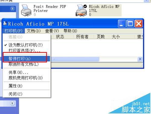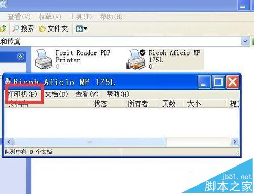 4、選擇設(shè)置。這時(shí)候,電腦桌面上會(huì)彈出如圖所示的以打印機(jī)命名的窗口,“Ricoh Aficio MF 175L”,在該窗口左上角,選擇”打印機(jī)“選項(xiàng),進(jìn)行設(shè)置