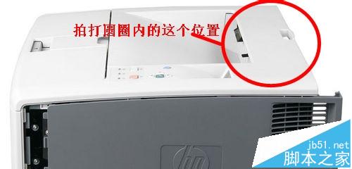3、首先我們?cè)?200L打印機(jī)開機(jī)的(開著的)狀態(tài)下,對(duì)著這個(gè)孔使勁吹氣。如果有電吹風(fēng)也可以用,但是要求用冷風(fēng)。在對(duì)著孔吹氣的時(shí)候,請(qǐng)使勁用手拍打HP 5200L打印傳感器的上面的位置,如下圖所示,請(qǐng)不要怕拍壞,拍不壞的,這樣做是雙管齊下趕走灰塵。如果有清理電腦用的小刷子,也可以對(duì)風(fēng)扇進(jìn)行清理下灰塵。關(guān)閉打印機(jī),然后再打開,查看是否解決了問題,否則多吹幾次試試,還是不行的話,請(qǐng)看下一步。