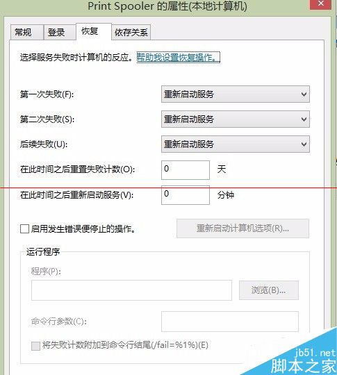 2、并將失敗計數時間,改為0天,0分鐘。但該方法,并未解決問題,每次啟動計算機,還是需要手動啟動該服務后,才能完成打印操作。