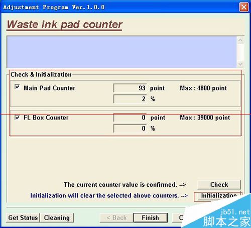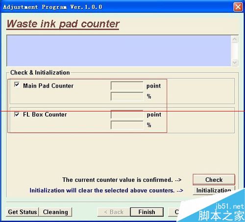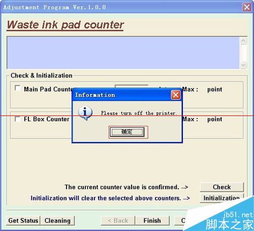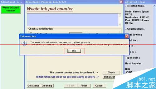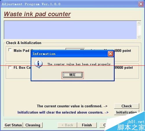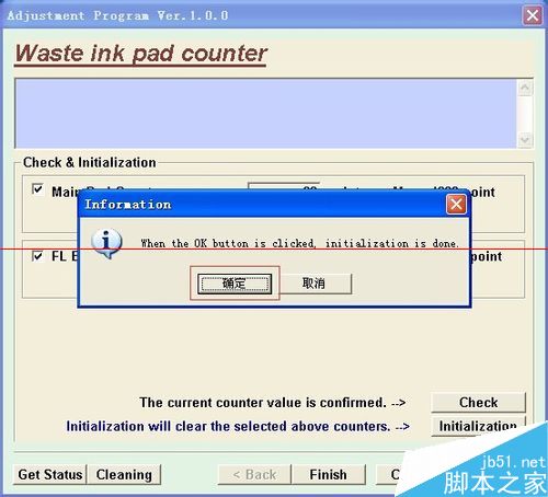 4、如下圖,勾選圖內(nèi)兩個選項并點擊“check”按鈕清空打印機(jī)的數(shù)據(jù),在彈出來的對話框內(nèi)點擊確定進(jìn)入下一步。