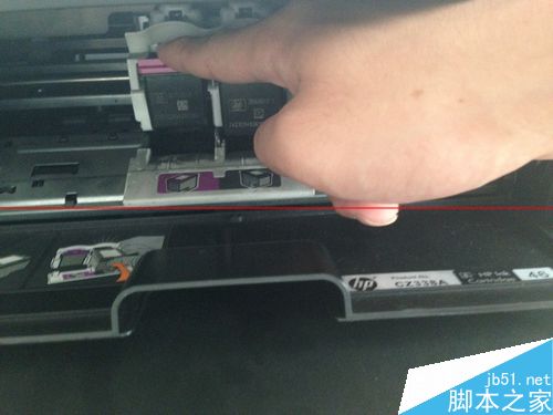 4、左側(cè)紫色的為彩色墨盒,右側(cè)黑色的為黑色墨盒,用手指輕輕向下按需要更換的墨盒,墨盒就會取下