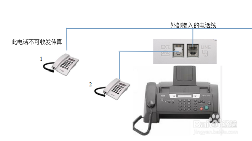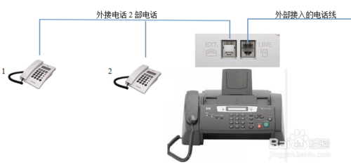5、另外一種接法就是在外部電話進入傳真機之前分出的電話機的接法。如下圖,這種情況下,1號電話就不能作來接收傳真了,這也是很多人收不傳真的原因。這時只有2號電話和傳真主機能夠用來接收傳真