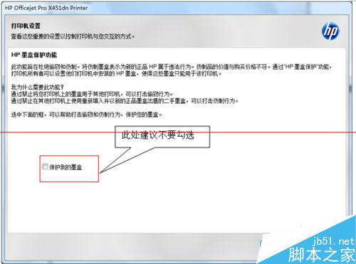 3、“保護(hù)我的墨盒”建議不要勾選,如果勾選,打印機(jī)會(huì)對(duì)當(dāng)前墨盒進(jìn)行鎖定,再無法在其他機(jī)器使用