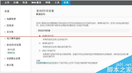 4、請注意,一如果選擇此選項打印機將不能打印彩色。二如在ews中無法找到此頁簽,請將打印機引擎固件版本升級到V5.0以上。