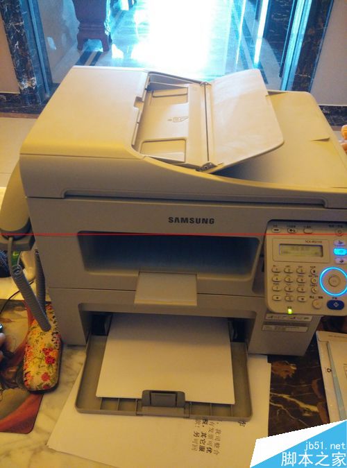 2、把要掃描的文件反方向放入傳真機中,要按著位置放好。蓋好,放置的時候不要有褶皺的地方。