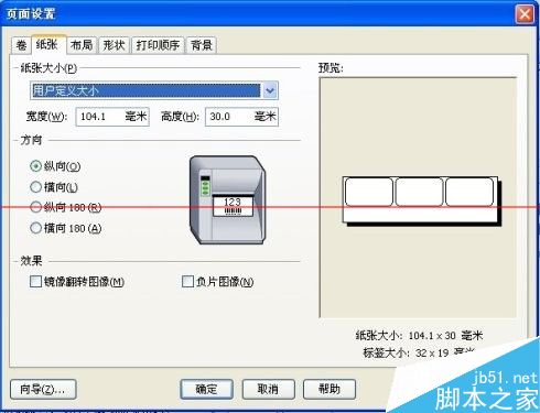紙張大小設(shè)置??蛇x擇【紙張大小】【用戶定義大小】【寬度】【104.1】【高度(實(shí)際尺寸)】。注意:這里要指定,寬度不變,機(jī)子測(cè)紙完后會(huì)自動(dòng)識(shí)別,不需要更改。高度可根據(jù)實(shí)際情況設(shè)定。
