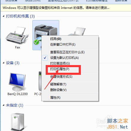 選中需要測試的打印機(jī),右鍵點擊找到打印機(jī)屬性,點擊進(jìn)入