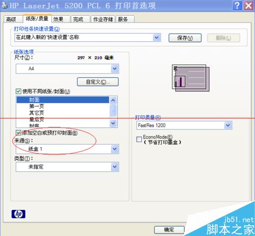 1、A:進入5200打印首選項當---紙張/質量,將使用不同紙張/封面選中(見下圖)