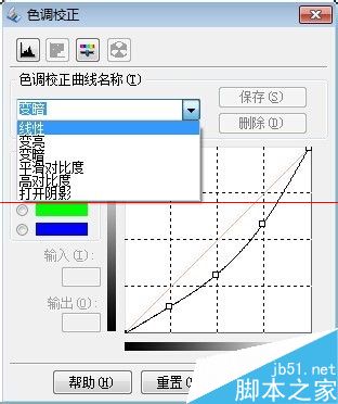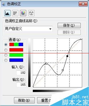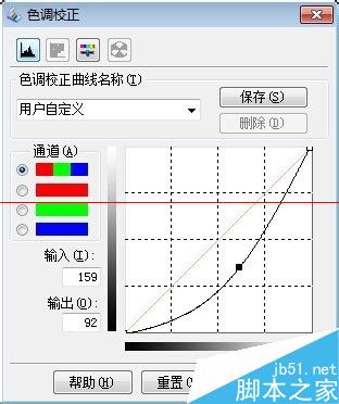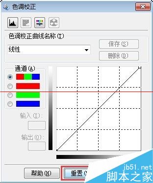 3、彈出設置對話框,主要有4個通道,分別為混合通道、紅色通道、綠色通道和藍色通道,在右方可以通過改變曲線的形狀調(diào)整輸入值和輸出值,如圖: