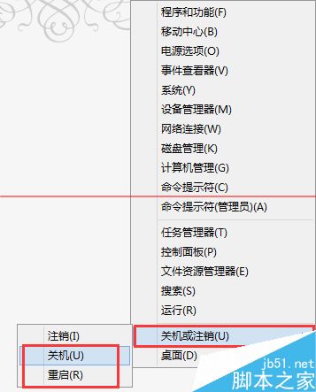 4、右擊開始按鈕,然后選擇 關機或注銷,重啟,重新啟動電腦: