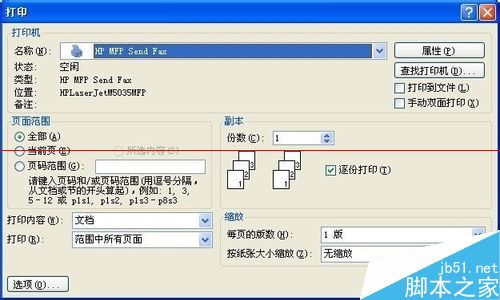 3、打印機(jī)的名稱 要選擇 HP MFP Send Fax,點(diǎn)擊打印界面的確定后會(huì)彈出發(fā)送傳真的界面