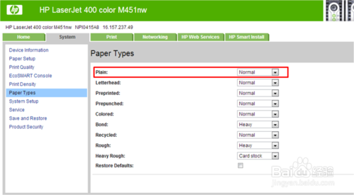 3、若菜單調整無效,登錄EWS/工具箱-系統-打印質量-普通紙-更改。
