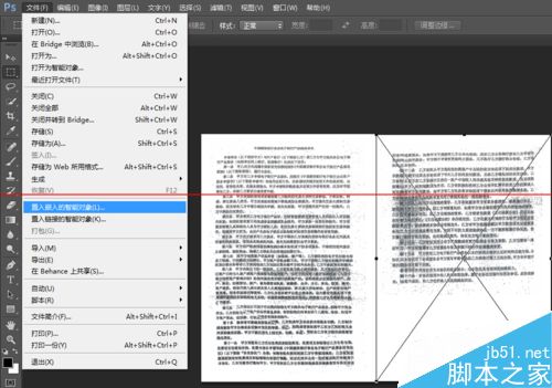 6、通過菜單“文件”--“置入嵌入的智能對象”將剛才掃描得到的圖片依次置入到新建的A3尺寸空白文檔中,根據原文檔布局調整好對象位置后,雙擊置入的對象,把X去掉,然后在屏幕右側菜圖層菜單中,在相應圖層上單擊右鍵,選擇“柵格化圖層”,完成后,按ctrl+e向下合并圖層,如圖: