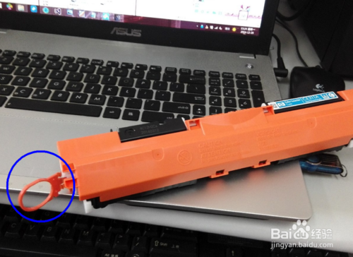 5、拆去新的硒鼓的黃色保護殼,還有一個類似拉環的東西用前一定要將其拉出來