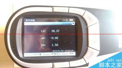 2、開機,對儀器進行黑白校準。將測試樣品放置在儀器測試口下方,保證樣品與測試口徑緊密接觸,防止環境光進入測量系統。按測試鍵,對樣品進行測量,得到顏色參數值,如下圖的所示
