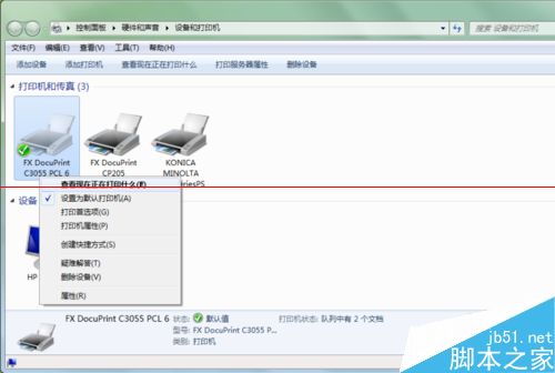2、右擊FX DocuPrint C3055打印機圖標,選擇【查看現在正在打印什么】,如下圖