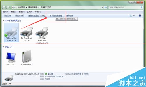 8、如果上述方法仍不能打印,則右擊打印機圖標,選擇出現的【打印服務器屬性】,如下圖