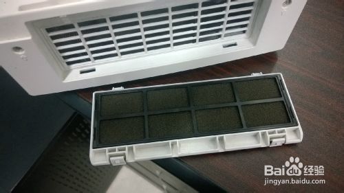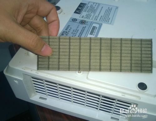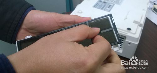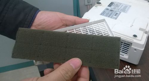 3、從濾芯板上拿出海綿,可以看到海綿的外面的一側(cè)已經(jīng)布滿了灰塵。把海綿清洗干凈以后,晾干,再放回投影機(jī)。